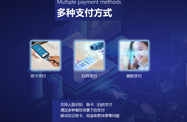 戈子科技智慧食堂可對(duì)接食堂一卡通系統(tǒng),實(shí)現(xiàn)刷卡支付;為滿足現(xiàn)代人消費(fèi)習(xí)慣,戈子科技智慧食堂可使用微信、支付寶等掃碼支付;戈子科技智慧食堂同時(shí)擁有先進(jìn)的金融級(jí)AI人臉識(shí)別技術(shù),員工在后臺(tái)錄入自己的人臉信息后即可使用人臉識(shí)別支付,人臉識(shí)別支付人均用時(shí)低于0.3秒,體現(xiàn)該技術(shù)的超高速識(shí)別。多種方式聚合支付的方式大幅度降低了就餐高峰期時(shí)的排隊(duì)等待壓力,總體提升企業(yè)食堂運(yùn)營效率,提高員工就餐的便利性。