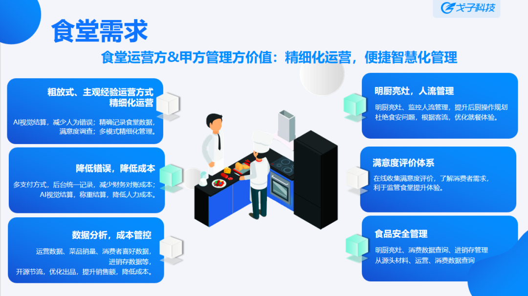 會議上,戈子科技以“全場景智慧食堂管理及智慧食安消費追溯方案”為主題,向與會研修班學員們介紹了智慧食堂全場景建設方案。