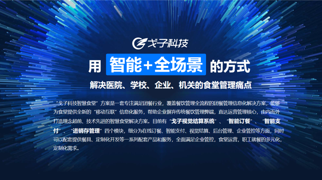 戈子科技是一家集研發(fā)、銷售、生產(chǎn)和服務于一體的高新技術企業(yè),致力于為團餐行業(yè)提供科學、高效的智慧食堂全場景解決方案!