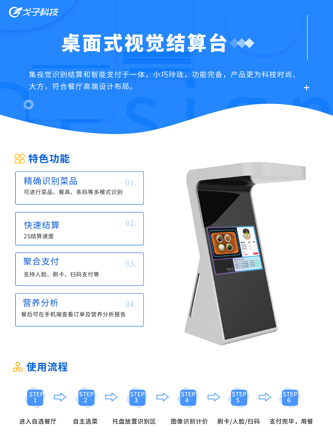 桌面式視覺結(jié)算臺集視覺識別結(jié)算和智能支付于一體,小巧玲瓏,功能完備,產(chǎn)品更為科技時尚、大方,符合餐廳高端設(shè)計布局。