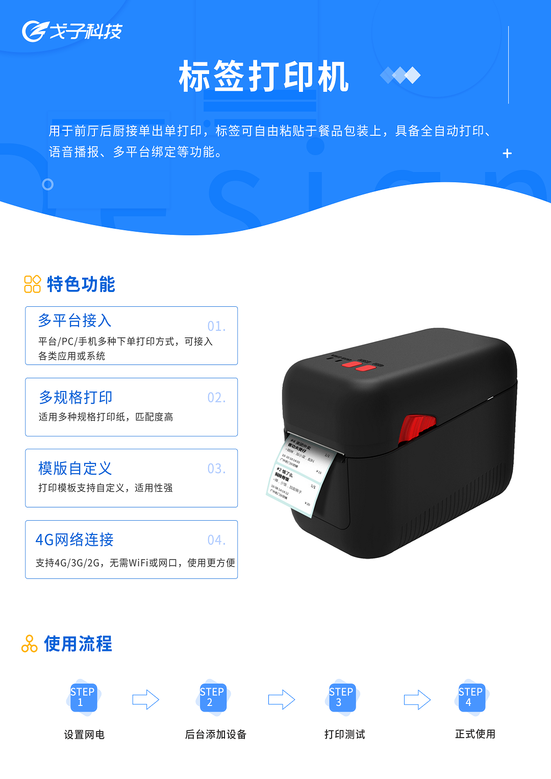 用于前廳后廚接單出單打印,標(biāo)簽可自由粘貼于餐品包裝上,具備全自動(dòng)打印語(yǔ)音播報(bào)、多平臺(tái)綁定等功能。