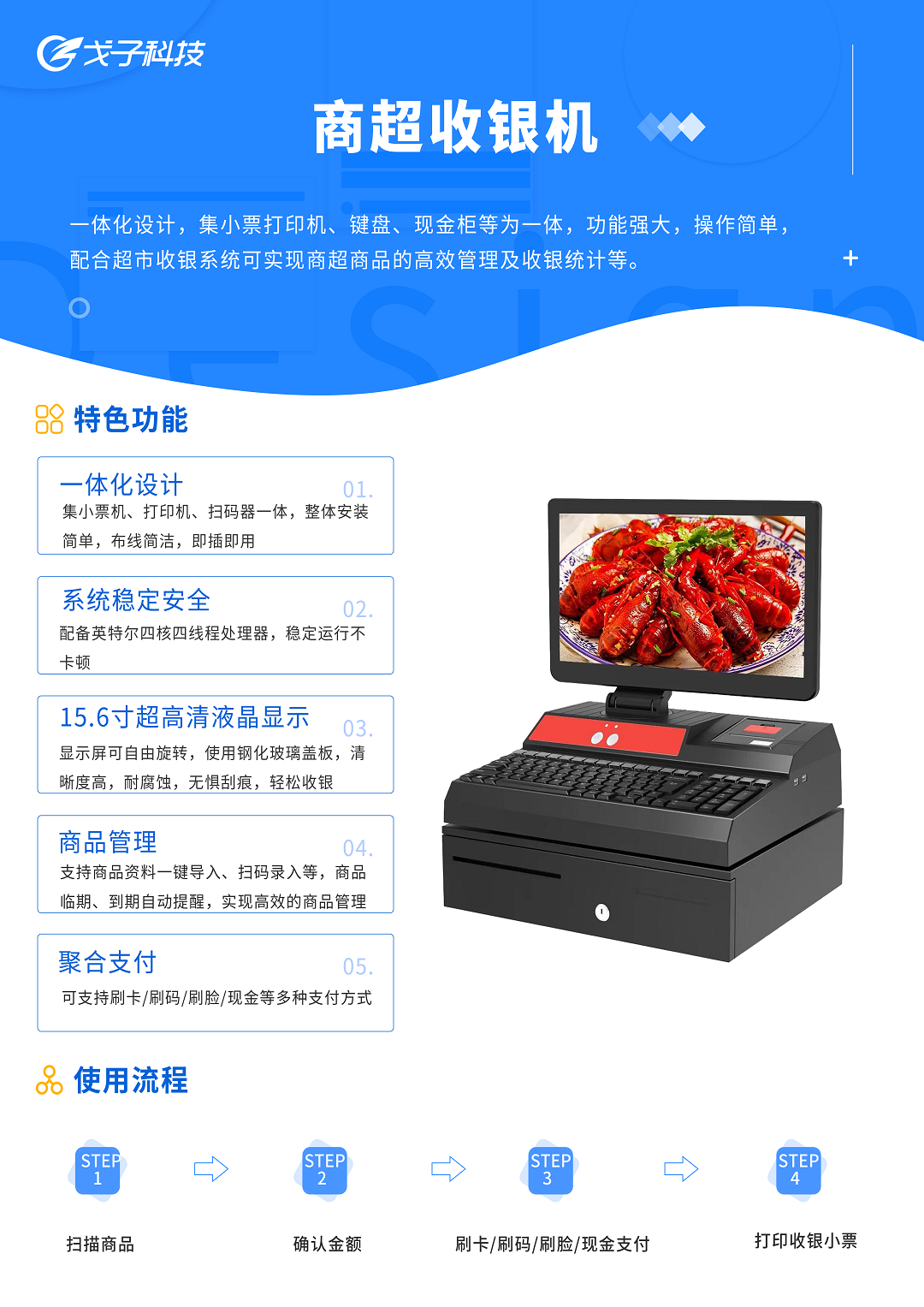戈子科技商超收銀機(jī)是一款一體化設(shè)計(jì)收銀機(jī),集小票打印機(jī)、鍵盤、現(xiàn)金柜等為一體,功能強(qiáng)大,操作簡(jiǎn)單,配合超市收銀系統(tǒng)可實(shí)現(xiàn)商超商品的高效管理及收銀統(tǒng)計(jì)等功能,實(shí)現(xiàn)智能商超管理。