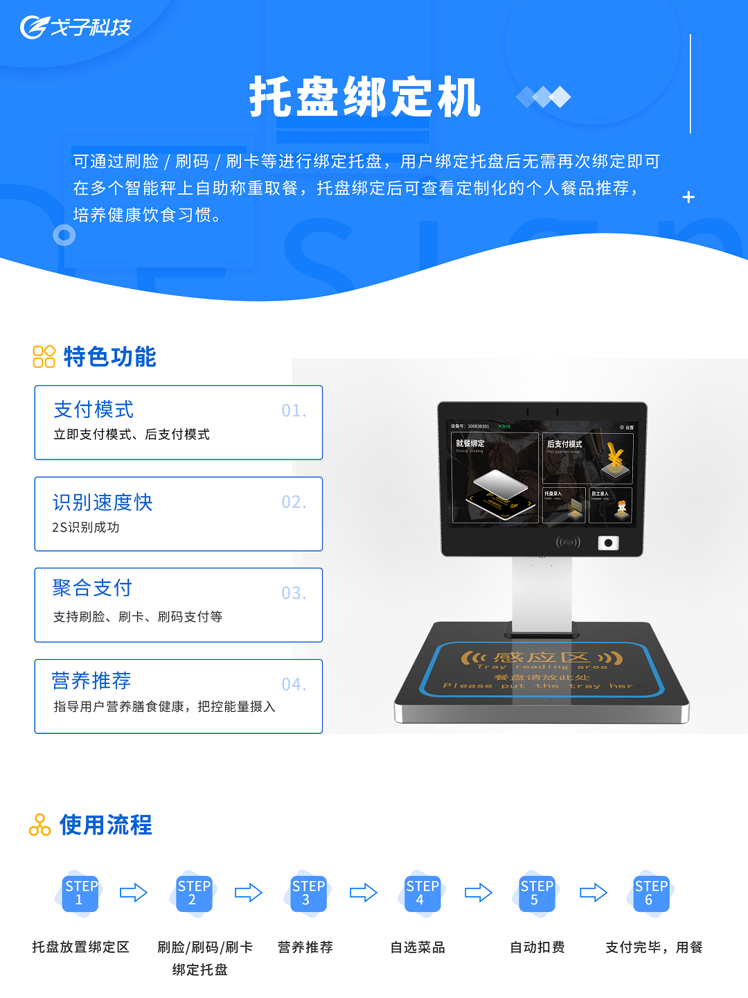 戈子科技智慧食堂托盤(pán)綁定機(jī)-餐廳內(nèi)部一卡通用戶(hù)可在人臉托盤(pán)綁定機(jī)上注冊(cè)人臉綁定托盤(pán),人臉已注冊(cè)的用戶(hù)可直接在托盤(pán)綁定機(jī)上通過(guò)人臉進(jìn)行綁定托盤(pán),用戶(hù)也可在托盤(pán)綁定機(jī)上直接刷卡綁定托盤(pán),用戶(hù)綁定托盤(pán)后無(wú)需再次綁定即可在多個(gè)智能秤上自助稱(chēng)重取餐,取餐完成后通過(guò)空中支付進(jìn)行就餐結(jié)算,以實(shí)現(xiàn)在餐廳稱(chēng)重取餐并無(wú)感支付的飲食體驗(yàn)。